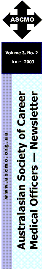 ASCMO Times Our journal, "ASCMO-times" will be sent out soon. Articles will include information on Bullying and the forthcoming Peripheral Hospitals Medical Eduation Conference in the Blue Mountains in October 2003. Minutes from Annual General Meeting will also be included. ASCMO's new Office Manager: Jacqui Riding has resigned from her position after three years of excellent service. Thanks Jacqui for your very professional contribution to our organisation and development of our website. Joanne Lewis has joined us as our new office manager, and the Committee welcomes you on behalf of all our members. ASCMO continues to promote CMOs as a viable career option: ASCMO was recently invited to provide an article about CMOs to the NSW AMA. David Brock provided an article which was published in the May 2003 edition of the "NSW Doctor". It is reproduced overleaf. Support ASCMO: Remember ASCMO, continues to the only representative organisation run by CMOs for CMOs. Our fees are tax deductible and nominal at only $100 per year. We rely on membership subscriptions to provide representation and maintain communication with our members (newsletters, office manager, teleconference and website facilities). Committee members provide their time and effort on a voluntary basis. Please support your organisation with renewed and new memberships. Applications available on our website at www.ascmo.org.au "ASCMO-talk": ASCMO's email discussion group is open to all members. Contribute or just be a fly on the wall. Contact our office manager to join at officemanager@ascmo.org.au ASCMO's Website: Our "Internal Search Engine" is the quickest way to find what you need is with our internal search engine .. simply type in your keyword(s) and away you go .. CMO Positions Check out adverts for CMO positions across Australia at www.ascmo.org.au/ads/cmo/cmo-posn.htm "Members Only" areas on ASCMO website: A current username and password are now required to access certain sections of our website. eg: Industrial awards, Salary Schedules and various topical subjects such as Bullying, etc. Contact ASCMO's office manager to obtain a Username/Password (contact details below). ASCMO and Area of Need applications for CMO positions. ASCMO has been recognised as a the relevant stakeholder that must be consulted before CMO positions can be designated "Area of Need" in NSW. ASCMO is using this opportunity to ensure that local CMOs are not denied access to CMO positions. If you feel you have been displaced by AON provisions please contact ASCMO's office manager. All correspondence to our new postal address: ASCMO Office Manager 23 Hidden Valley Rd BONOGIN QLD 4213 email: officemanager@ascmo.org.au ABN 2902 5855 425 |